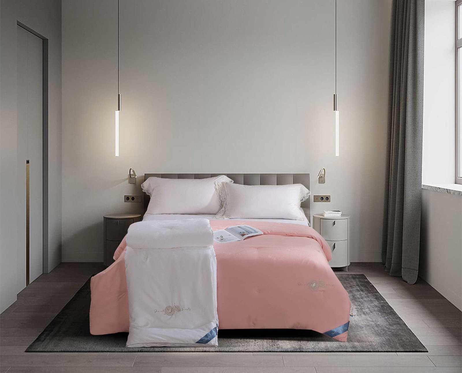 填充高品质桑蚕丝,蚕丝中约97%的成分是纯天然动物蛋白,跟人体皮肤接近,因此有很好的亲肤性。蚕丝纤维集轻、柔、细、长于一身,有“纤维皇后”的美誉。蚕丝被集众多优点于一身,自古以来就是达官贵人专享的奢侈品。精美的烫钻让被子更具艺术美感,值得享用与馈赠亲朋。